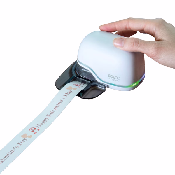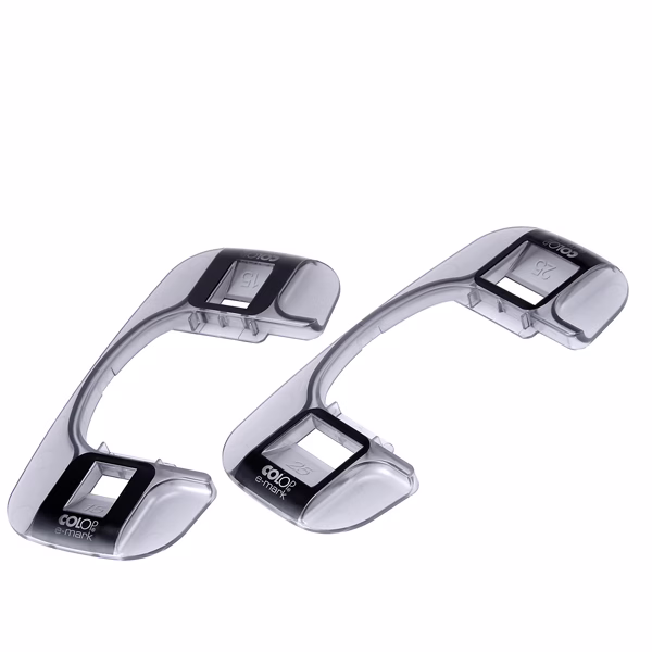 Con la guida, i nastri possono essere personalizzati molto rapidamente e facilmente. È sufficiente far passare il nastro attraverso la guida e spostare l’e-mark sul lato destro o sinistro insieme alla guida del nastro. Set 15 + 25 mm
