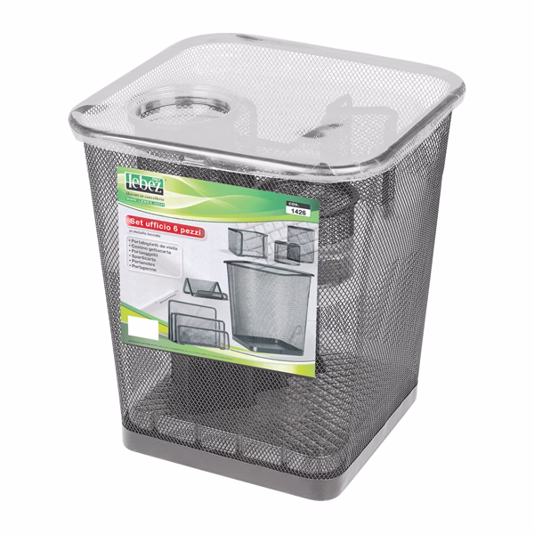 Set scrivania in rete metallica, composto da 6 accessori: sparticarte, cubo portamemo, portapenne, portafermagli, portabiglietti da visita e cestino gettacarte.