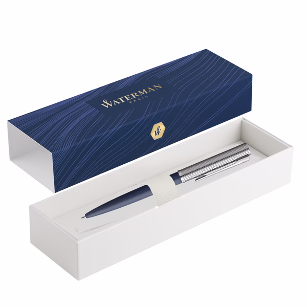 Penna a sfera con corpo blu e meccanismo a rotazione in acciaio. Fornita con refill blu.