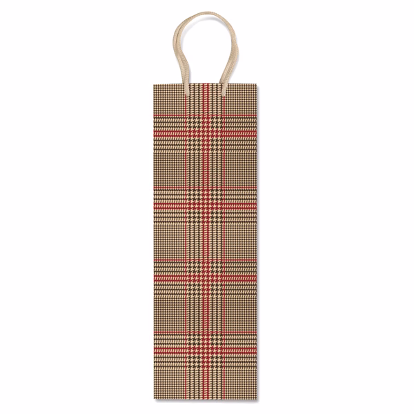 Shopper portabottiglia in carta patinata fantasia scozzese dotato di manici in cordino.