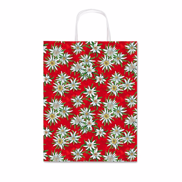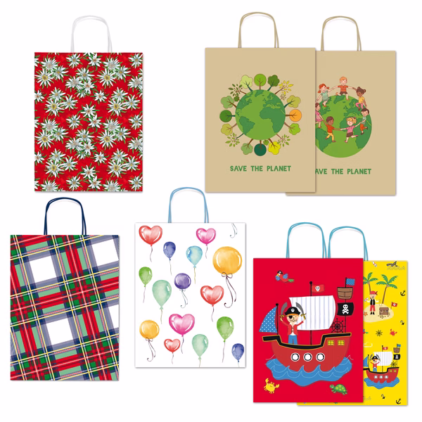 Shopper regalo realizzato in carta kraft bianco con stampe a colori. Dotato di manici in carta ritorta. Assortimento di 5 differente fantasie.