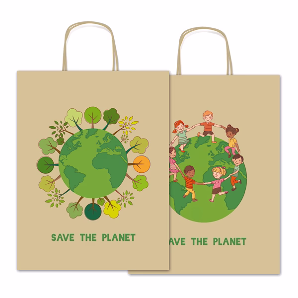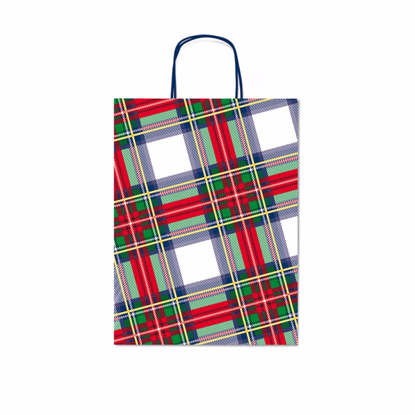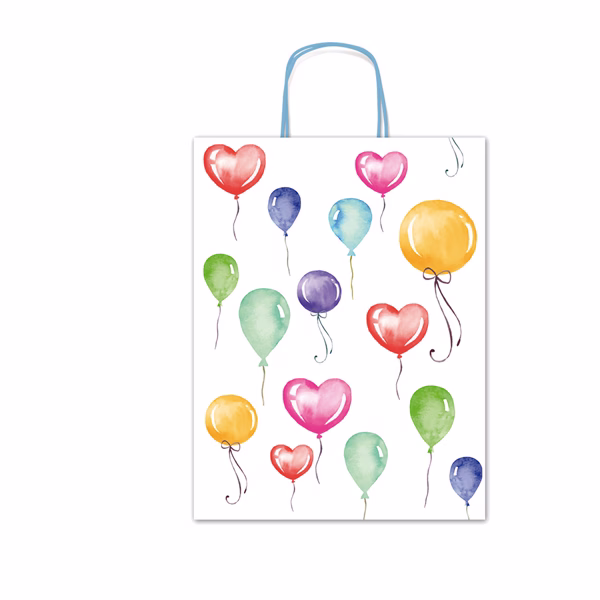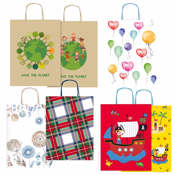 Shopper regalo realizzato in carta kraft bianco con stampe a colori. Dotato di manici in carta ritorta. Assortimento di 5 differente fantasie.