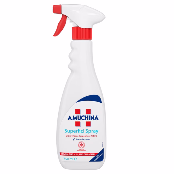 Disinfettante ad azione battericida e virucida con sgrassatore attivo che permette la disinfezione di tutte le superfici trattate, anche quelle particolarmente unte e caratterizzate dallo sporco più resistente (forni e fornelli, piani di preparazione dei cibi, frigoriferi, ecc.). Risulta adatto per l’igiene di tutte le superfici che vengono in contatto con i neonati e bambini (fasciatoi, seggioloni, lettini, vasche per il bagnetto, giocattoli, ecc.). In flacone da 750 ml con pratico nebulizzatore. E’ un presidio medico chirurgico. Modalità d’uso: Ruotare il beccuccio in posizione ON e spruzzare da 20-25 cm, fino a coprire la superficie da disinfettare.L’azione antibatterica si ottiene dopo 15 minuti di contatto. Passare con un panno asciutto e risciacquare con acqua per rimuovere i residui del prodotto. Per ottenere un’azione virucida, lasciare il prodotto a contatto con la superficie per 30 minuti. Da non utilizzare sul legno naturale non trattato, alluminio e zinco. Prima dell’uso provare il prodotto su una piccola area nascosta della superficie da detergere.