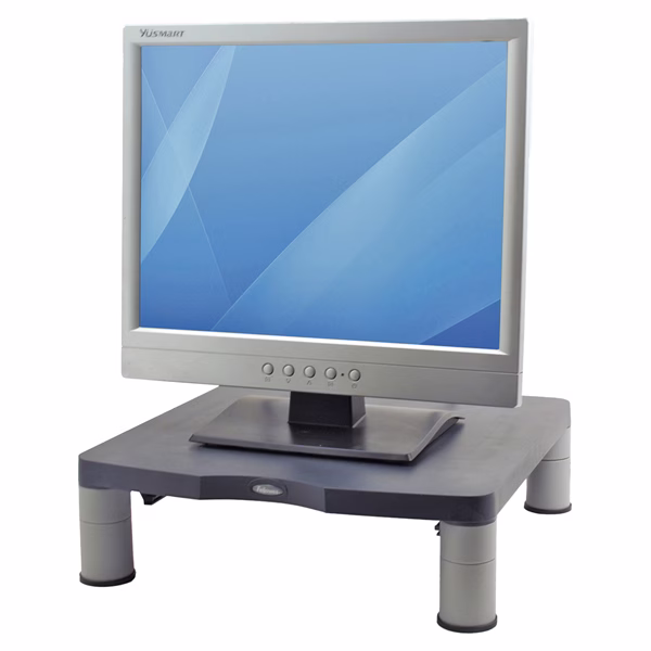 Supporto monitor Standard per monitor CRT o TFT/LCD fino a 36kg o 21”. Costituito al 100% in plastica riciclata. Regolabile in altezza da 50mm a 100mm. Piedini antiscivolo adatti ad ogni superficie. Dimensioni: 33,5x33x5-10cm
