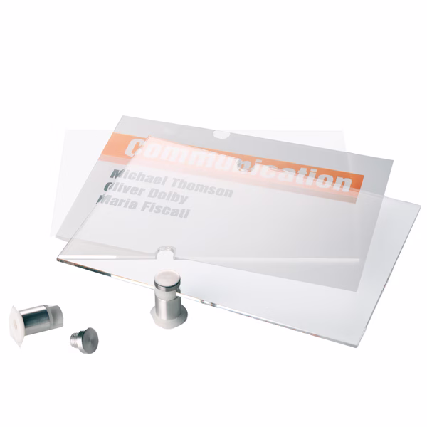 Targa professionale per porte e pareti dal design semplice ed elegante in acrilico di alta qualità, può essere perfettamente adattata al vostro corporate design grazie ai 2 fogli inserto A4 semi tranlucidi pretagliati inclusi nella confezione. I pannelli in acrilico trasparente e gli inserti semi translucidi, sono l’ideale per ogni tipo di ambiente. Kit per il fissaggio con viti e istruzioni di montaggio incluso. Formato targa 105 x 105 mm.