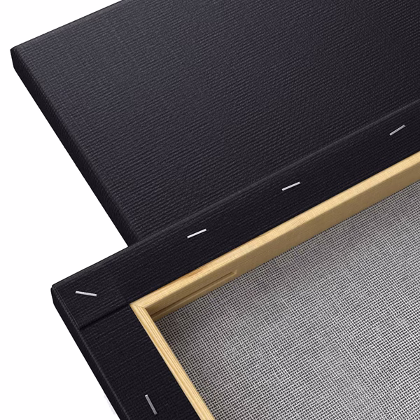 Tela perfettamente tesa su telaio in legno. Preparata con un metodo universal che le rende un supporto ideale per colori a olio, tempere e acrilici.