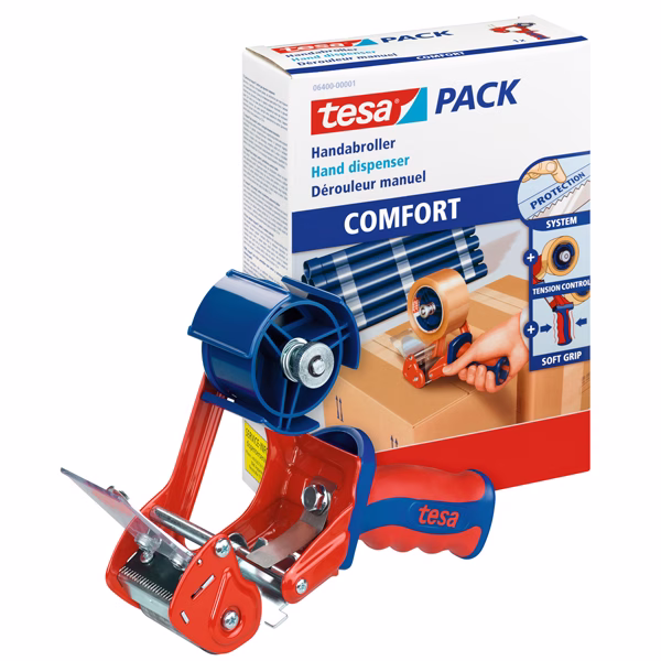 Dispenser tendinastro professionale Tesa per nastri da imballo e con controllo della tensione, regolabile manualmente. Impugnatura in gomma morbida per una presa comoda e sicura Lama protetta, nastri fino a 50mm.