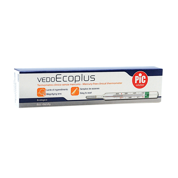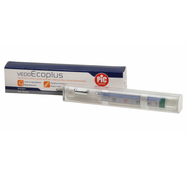 Termometro clinico senza mercurio per la misurazione della temperatura corporea. Il liquido impiegato e’ una lega di gallio, indio e stagno, completamente atossica e non nociva per l’ambiente.Con pratico astuccio di contenimento in plastica che funziona da lente di ingrandimento per una facile lettura della misurazione effettuata.