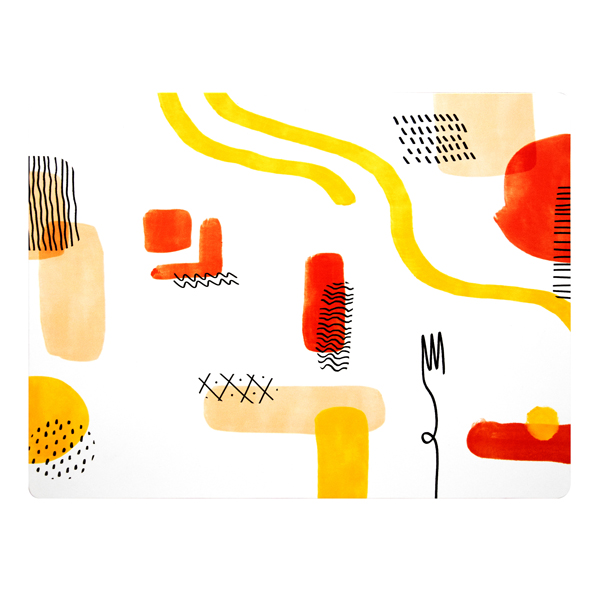 Un omaggio alla cucina italiana in chiave astratta. Tovaglietta americana 41x31cm realizzata su pelle rigenerata (spessore 1,8mm). Lavabile con un panno umido.