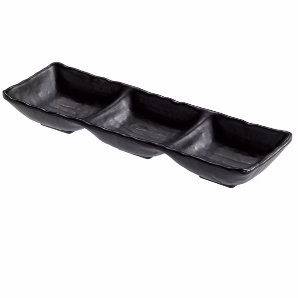 Vassoio a 3 scomparti in melamina nera, 27x9x3,5 cm. Peso netto 210gr. Capacità: 90ml +90ml+90ml Colore Nero. 100% Melamina, prodotto idoneo al contatto con tutti i tipi di alimenti (T max70°C). Articolo lavabile in lavastoviglie; Da non utilizzare con utensili taglienti. Prodotto da non utilizzare unitamente all’alimento nel forno tradizionale e forno a microonde; Conservare il prodotto in luogo asciutto,lontano dai raggi del sole e fonti di calore(0°C+35°C).
