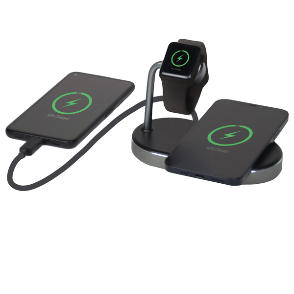 La stazione di ricarica 3-in-1 di Verbatim consente di caricare tutti i tuoi dispositivi contemporaneamente. Ricarica in modalità wireless l’Apple Watch, l’iPhone (8 o successivo) o un altro dispositivo abilitato alla ricarica wireless con certificazione Qi, e un terzo dispositivo via cavo tramite la porta Quick Charge 3.0 USB-A.