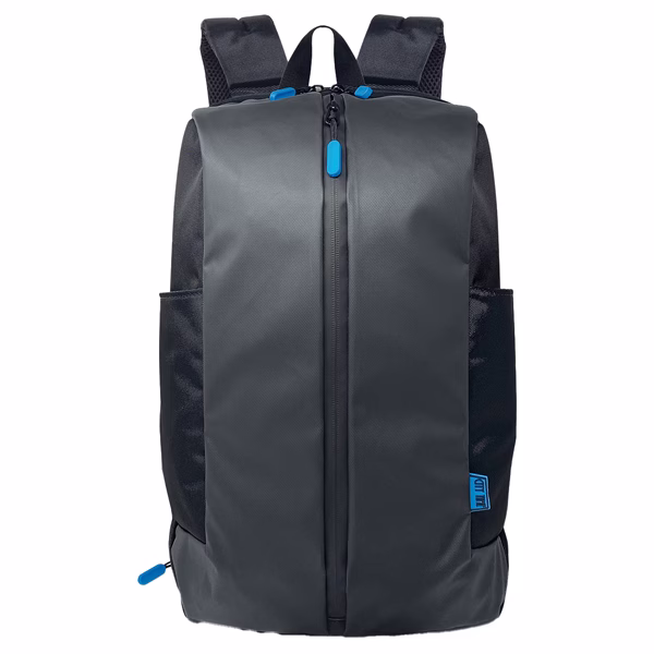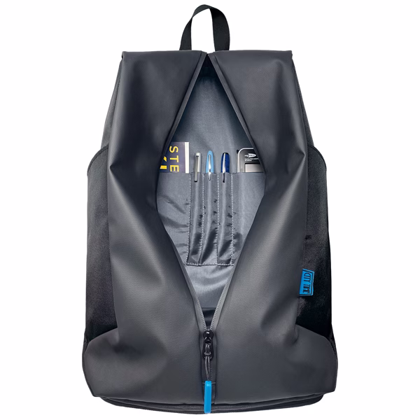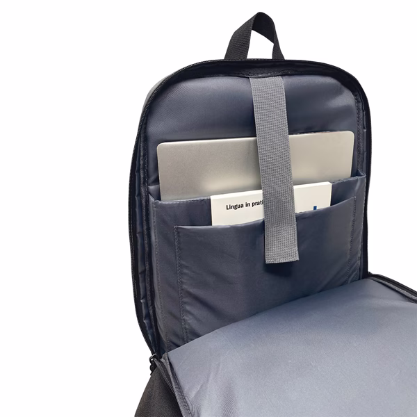 Zaino a 3 scomparti in tessuto tecnico antigraffio e antipioggia. Scomparto con divisorio imbottito per PC/Tablet, tasche laterali, tasche interne portaoggetti, scomparto per scarpe. Dotato di dorso e spallacci imbottiti traspiranti e fascia posteriore per trolley. Dimensioni: 31x46x18,5cm.